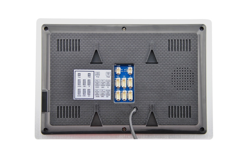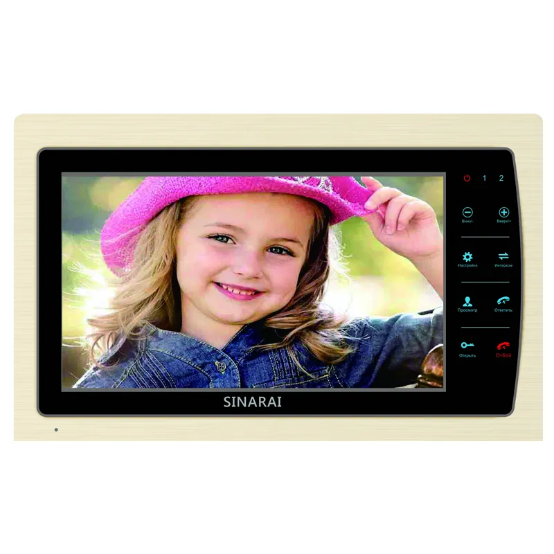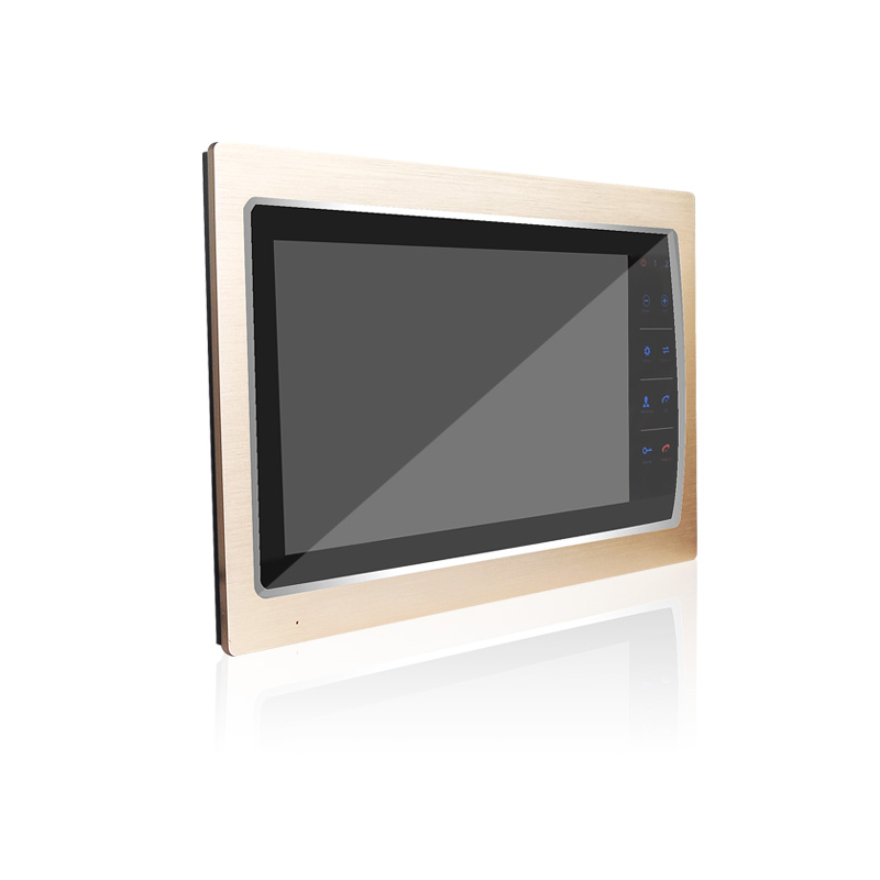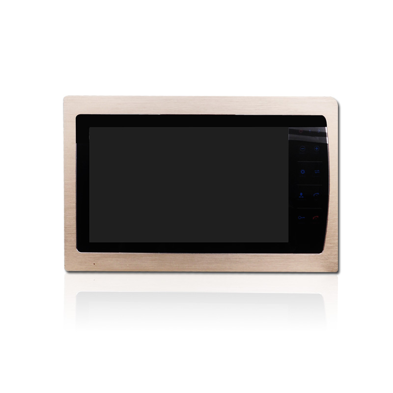 Цветной, многофункциональный видеодомофон с большим экраном 10 дюймов и стильной металлической накладкой золотого цвета.